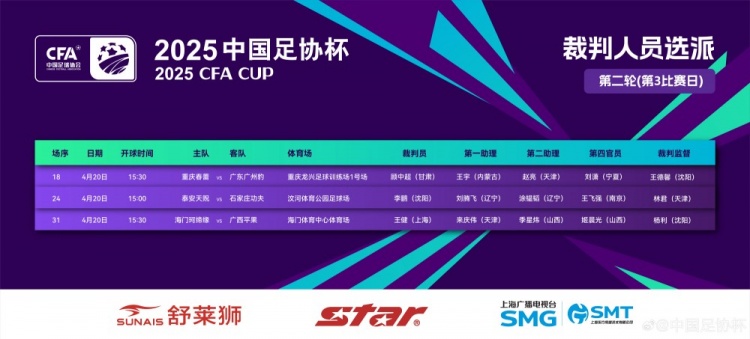 4月20日宣 今天下午,2025中国足协杯第二轮第3比赛日继续进行。赛前,官方公布了裁判员选派名单。其中,顾中超将主哨重庆春蕾对阵广东广州豹的比赛。