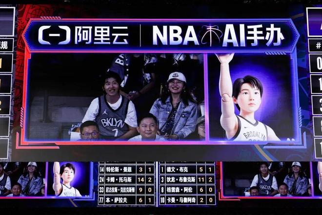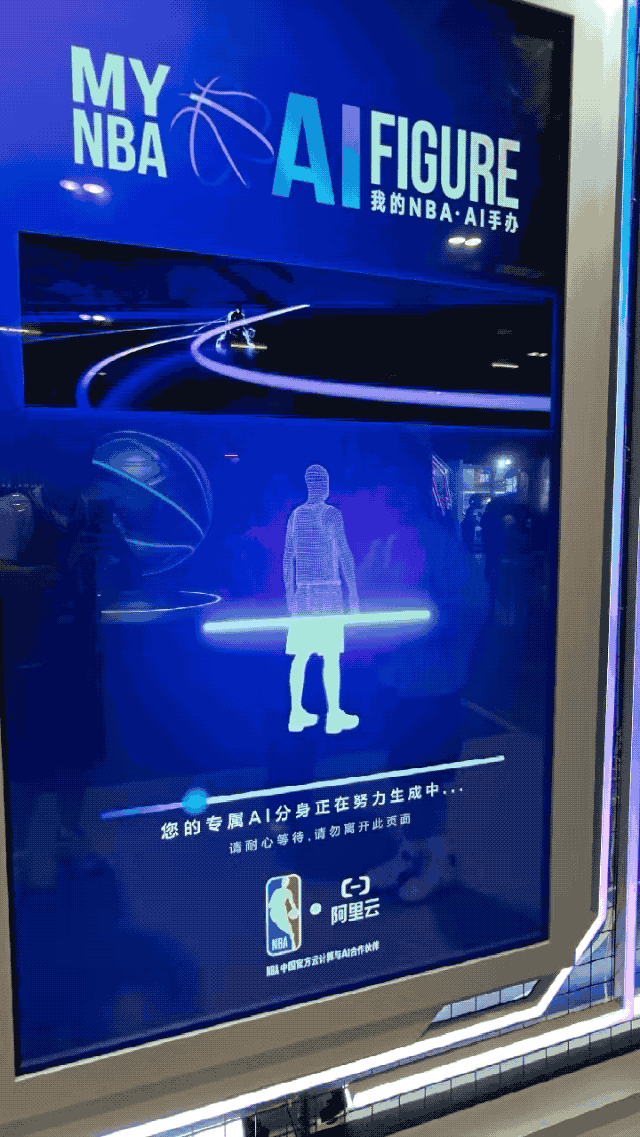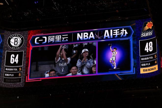 球场大屏还会通过现场摄像头捕捉身穿球衣的球迷形象,随后由阿里云 AI 生成专属「球迷潮玩」——穿着主队球衣,配合动作,以「球星收藏手办」的形式展现在屏幕上,并与真人同框对比。这是 NBA 赛场上呈现的的首个 AI-CAM Show,是将赛事观看与球迷互动的一次深度重塑。