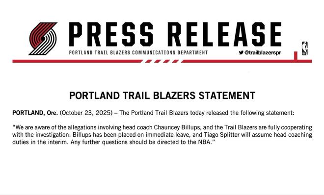 开拓者官方:比卢普斯目前已被停职,球队正全力配合调查
