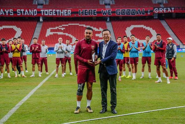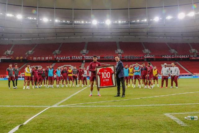 海港今日训练前,党总支书记沙良昌为李帅颁发百场纪念球衣