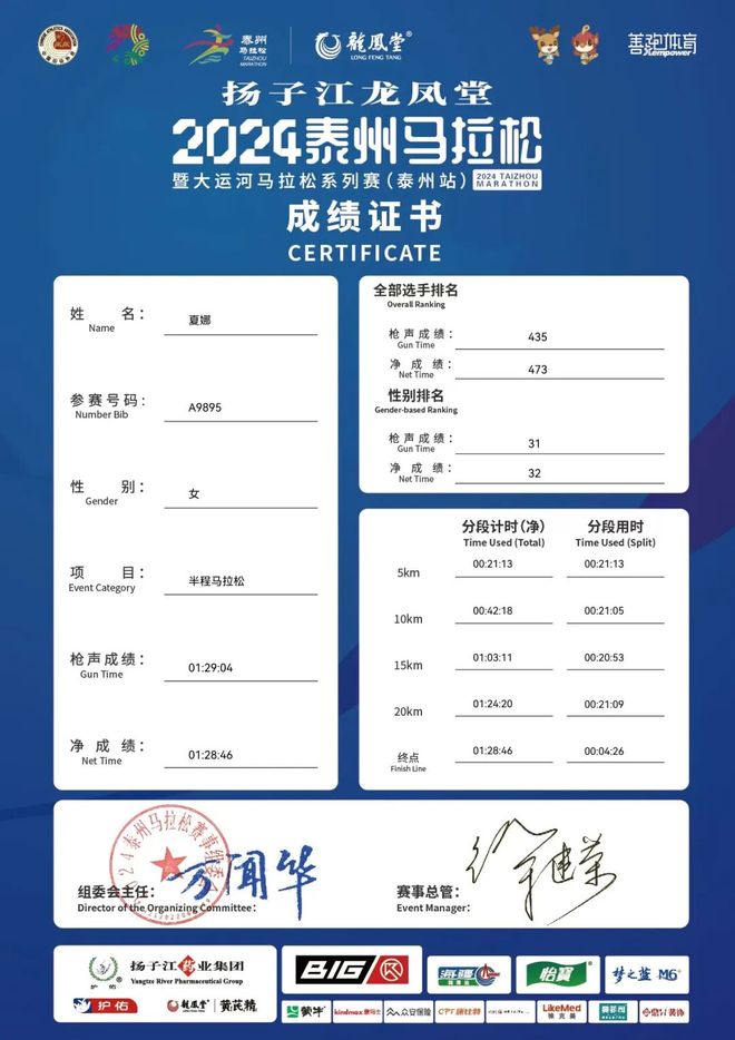 夏 娜在泰州马 拉松半马顺利跑进130