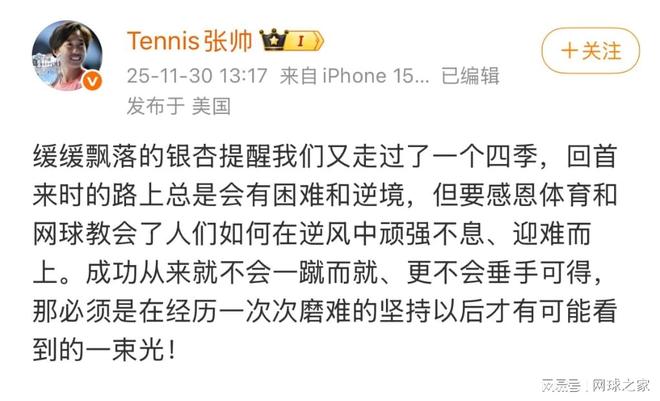 “感恩网球教会了如何在逆风中顽强不息、迎难而上。成功从来就不会一蹴而就、必须是在经历一次次磨难的坚持以后才有可能看到的一束光!”张帅在兑现重返TOP100的承诺后,赛后通过个人社交媒体发布的这篇小作文将自己如何经历逆境,以及最后逆风飞扬的原因予以了披露,内容情真意切十分感人,也让外界再次看到了一个认真的张帅有多么可怕,似乎真的无所不能。