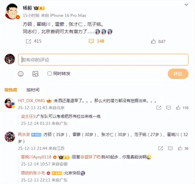 知名篮球评论员杨毅直接讥讽道:“方硕,翟晓川,雷蒙,张才仁,范子铭。同志们,北京首钢可太有潜力了……”