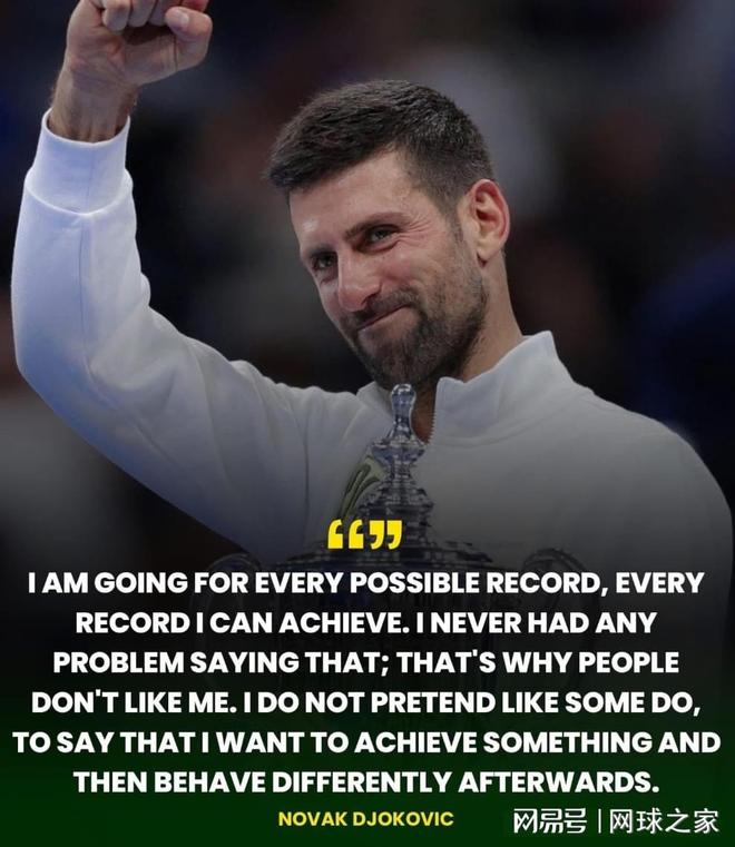 “我要冲击所有可能的纪录,所有我能达成的纪录,我从来不觉得说这些有什么问题,这就是为什么人们不喜欢我。”德约坦言,自己向来不擅于伪装,心里怎么想就直接说出来,就算别人因此不喜欢自己,也会清楚地对外表达自己内心的所思所想。