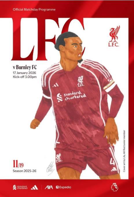 根据利物浦官方的公告,俱乐部的“全红(All Red)”会员计划举办了一场比赛,让所有16岁以下的青少年会员有机会设计节目的封面,在120多份参赛作品中,莉莉(Lily)的创作获胜,她还赢得了两张招待券。