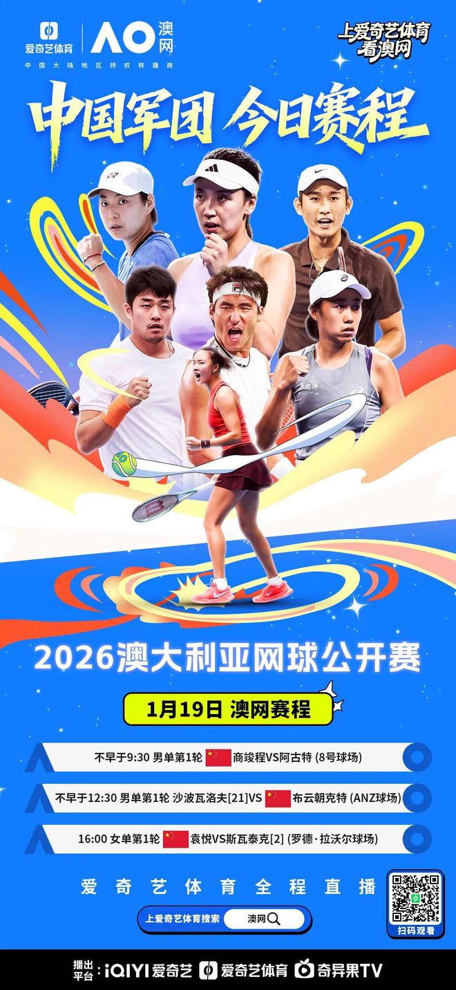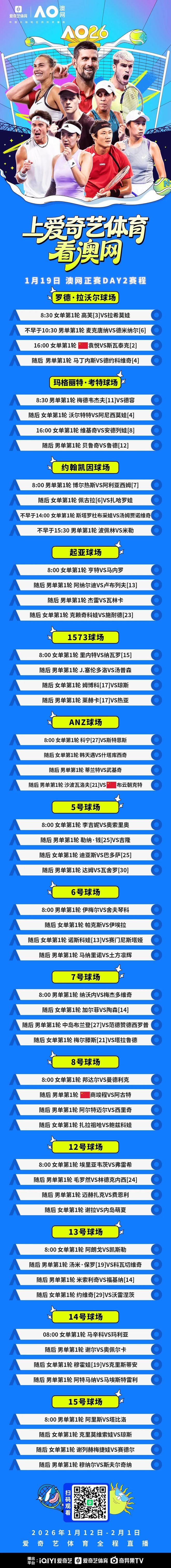 北京时间1月19日,2026澳大利亚网球公开赛第2日比赛将在墨尔本公园全面打响。直播间传送门——(手机/pad点击→阅读原文)。
