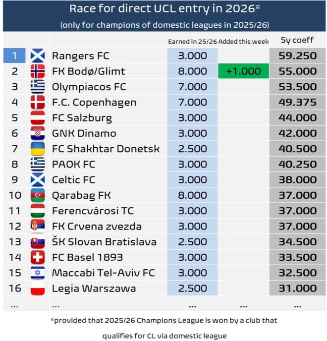 雷速体育10月2日宣 在欧冠战平托特纳姆热刺后,博德闪耀的欧足联俱乐部积分来到了55分。因此成为欧足联国家系数前十之外国家中排名最高的联赛冠军。这意味着,如果博德闪耀在2025年赢得挪威超级联赛冠军,他们将直接晋级2026年欧冠联赛,无需参加资格赛。