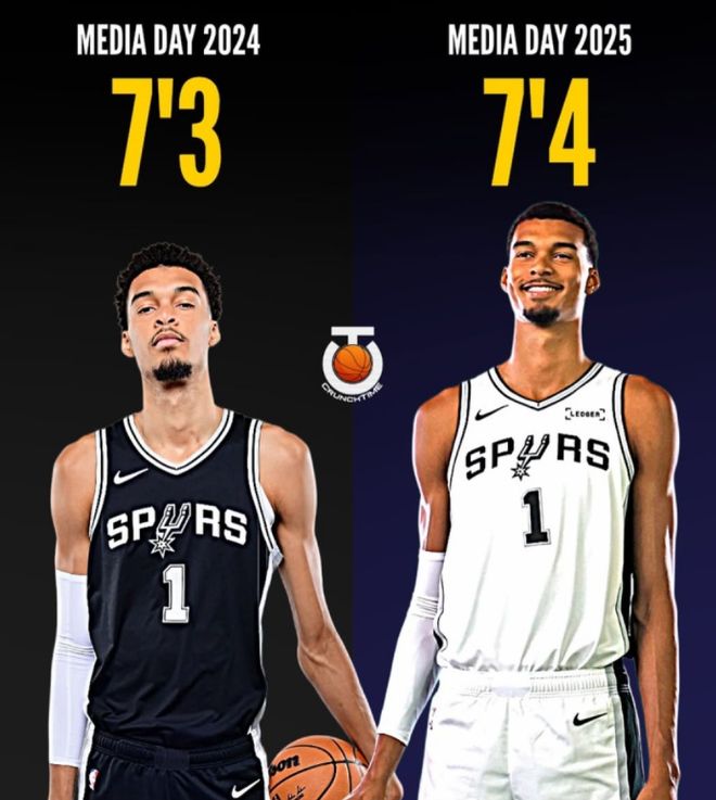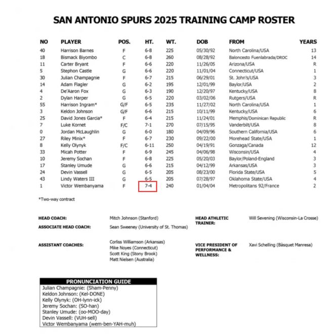 就在9天之前,NBA媒体日马刺队官方公布的季前赛名单中,文班亚马的身高还是7尺4寸,体重240磅,短短9天文班亚马就从7尺4长到7尺5?9天长了2厘米,这你们觉得可能吗?