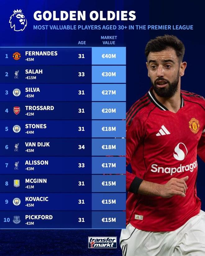 - 英超 | 德转列英超30+岁球员身价榜:B费4000万欧居首,萨拉赫第二