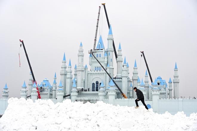 长春粉雪嘉年华园内大型冰雪城堡正在紧张筹备中。